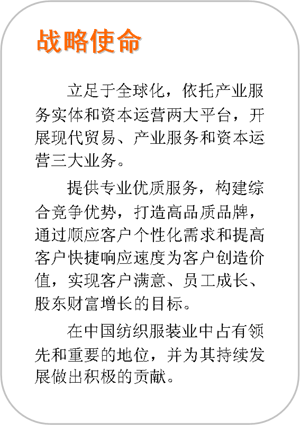 產(chǎn)業(yè)服務(wù)業(yè)是紡織工貿(mào)集團在未來五年中加速發(fā)展的戰(zhàn)略業(yè)務(wù),該板塊主要是圍繞著集團紡織服裝這一主業(yè),通過整合集團資源,提升資源使用效率,獲取產(chǎn)業(yè)鏈競爭優(yōu)勢,重點打造廣州T.I.T國際紡織城。