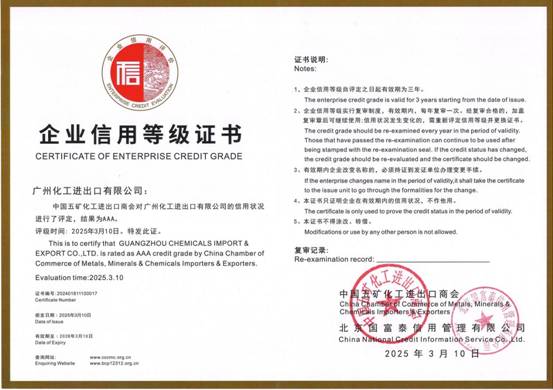 In June 2025, Guangzhou Chemicals lmport and Export Co., Ltd was rated as “AAA Credit Grade” by China Chamber of Commerce of Metals, Minerals & Chemicals Importers & Exporters (CCCMC), in recognition of its robust operational strength and industry contributions. This prestigious endorsement further validates the company’s high-quality development.